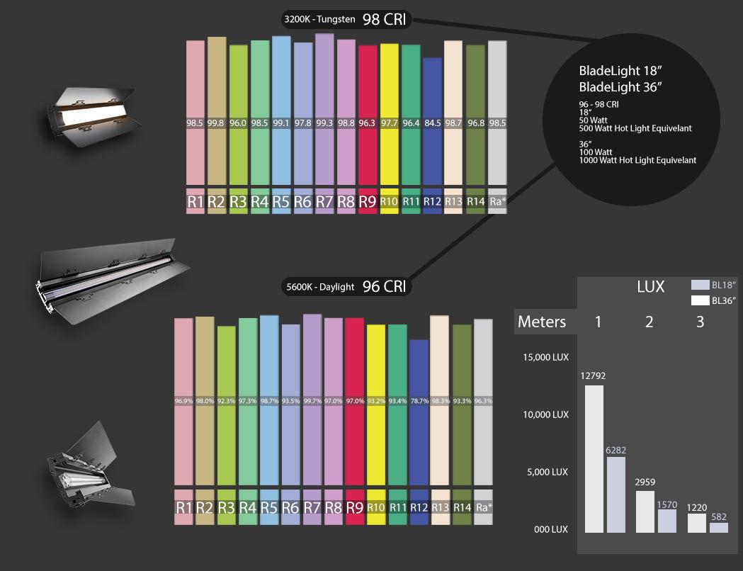 The BladeLights unique length in 36" and 18" versions allows the BladeLight to act like a Longer tube fluorescent lighting solution. Placing diffusion on the Barndoors, or Silks in front of the BladeLight create a much stronger Soft Panel LED lighting solution.Unlike standard Softpanel LED Lighting solutions, the BladeLight is also flexible to offer incredible sharp cuts, by shaping the light with the included barn doors. Standard LED Panels have slotted shadows (Muliple shadows) when you cut the light with their attached Barndoors or Flags. Soft Panel LED's simply cannot have an effective cut, because of the nature of diffused light.The BladeLight unique patent-pending linear design offers beautiful wrap-around light when positioned horizontally and infinite shadow control when turned towards a vertical orientation.QUALITY LEDS The BladeLight is available in Daylight, Tungsten, Bicolor*(Coming Soon) and Green versions for use with green screens. With the green LED version you can light a green screen 10 feet wide by 10 feet high with just two lights. The Daylight/Tungsten LEDs offer 95+ CRI with high R9 and R12 values for perfect skin tones.