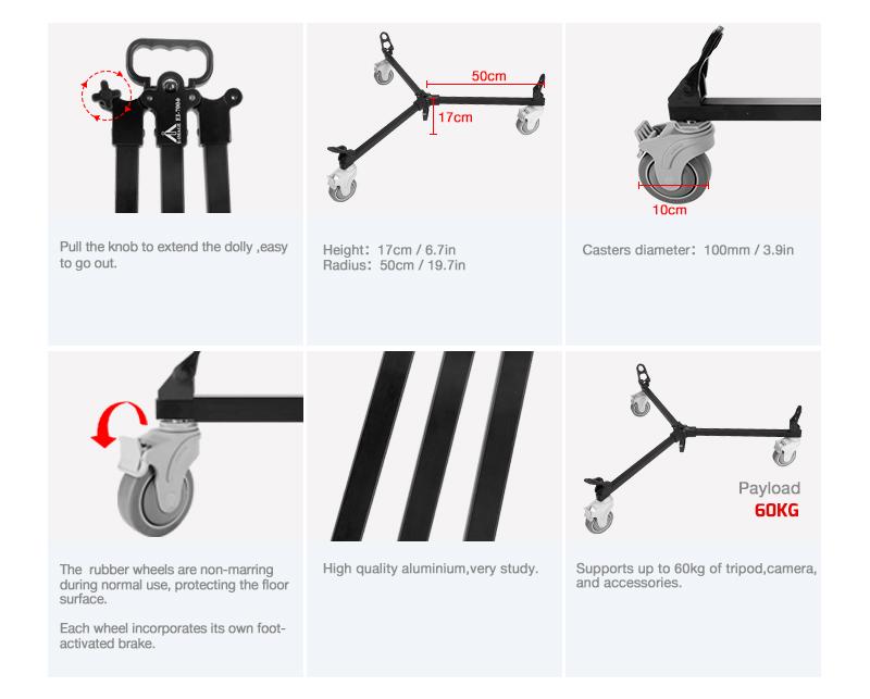 Ausgelegt für mittelschwere Stative. Die 100mm/4 Zoll-Räder verfügen über eine Trittsicherheitsfunktion und können individuell gebremst werden. Zum Transport zusammenklappbar. Technische Daten Nutzlast: 60kg / 132,2in Nettogewicht: 3.2kg / 7.1lbs Fußabdruck-ø: 100cm / 39.4in Durchmesser der Rollen: 100mm / 4.0in
